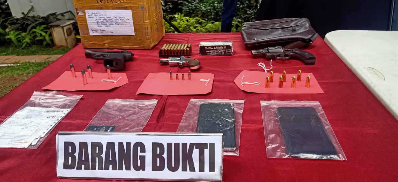 Bersama dengan tersangka, polisi mengamankan barang bukti berupa satu pucuk senjata api jenis revolver merk S and W Nomor Senjata 74061 dan empat butir peluru caliber 38 Special.
