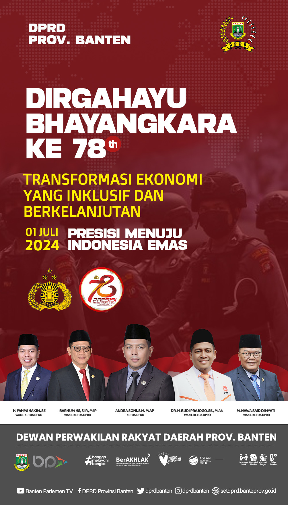 DPRD Prov Banten Mengucapkan Dirgahayu Bhayangkara Ke 78 Tahun01 Juli 2024 | 13:41 WIB01 Juli 2024 | 13:42 WIBoleh Redaksi-oleh RedaksiBaca Juga Momen Penuhi Haru, Lapas Kelas IIA Cilegon Gelar Acara Sertijab Dan Pisah SambutJangan LewatkanDari Mandalika untuk Dunia: Kahf Dampingi Juara MotoGP Marc MárquezH. Ahmad Badri Maulana, B.A Aktivis Pembentukan Provinsi BantenTanamkan Nilai Ibadah Sejak Dini RA Bina Warga Kota Serang Mengikuti Manasik HajiPemkab Serang dan Uni Emirat Arab Jajaki Peluang KerjasamaMER-C Salurkan Ratusan Paket Bantuan Makanan untuk Staf RS As Shifa