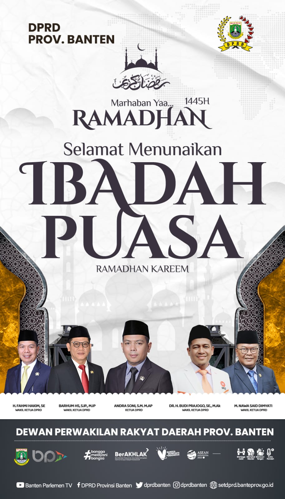 DPRD Provinsi Banten Mengucapkan Selamat Menunaikan Ibadah Puasa12 Maret 2024 | 14:14 WIBoleh Redaksi-oleh RedaksiBaca Juga Ketua DPRD Kota Bekasi: Musrembang Sebagai Wadah Pembentukan Komitmen Seluruh Stakeholder di Kota BekasiJangan LewatkanPWI Pusat Gelar Orientasi Jelang Pelantikan Pengurus 2025–2030Hari Jadi ke-499 Kabupaten Serang, Bupati Ratu Zakiyah Salurkan Ratusan Paket SembakoDari Mandalika untuk Dunia: Kahf Dampingi Juara MotoGP Marc MárquezH. Ahmad Badri Maulana, B.A Aktivis Pembentukan Provinsi BantenTanamkan Nilai Ibadah Sejak Dini RA Bina Warga Kota Serang Mengikuti Manasik Haji