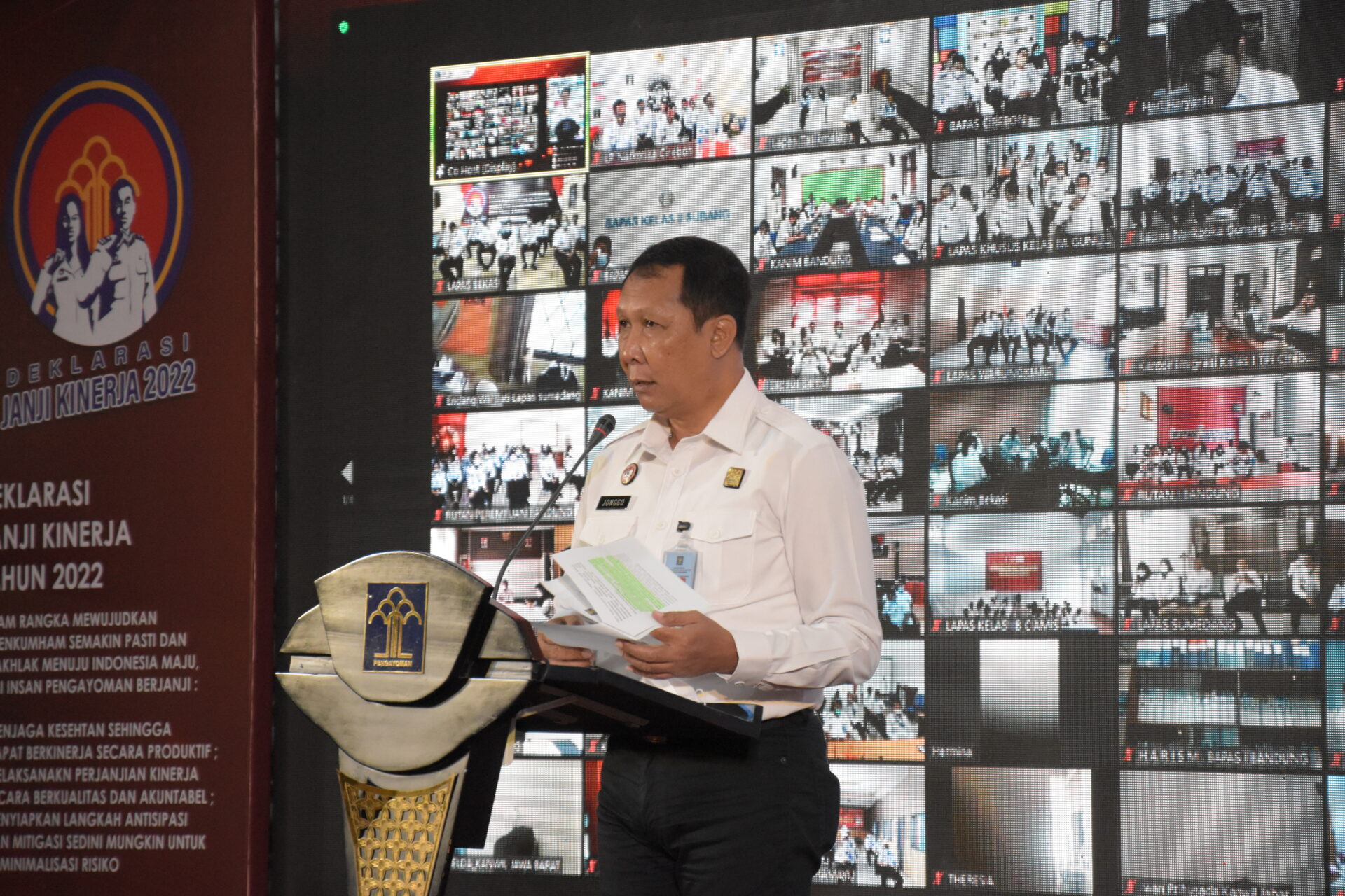 Dalam laporannya Kepala Kantor Wilayah Sudjonggo melaporkan Deklarasi Janji Kinerja Kantor Wilayah Kementerian Hukum dan HAM Jawa Barat Tahun 2022 dilaksanakan di Aula Kantor Wilayah Kementerian Hukum dan HAM R.I Jl. Jakarta No. 27 Lt.II Bandung serta dihadiri Stakeholder yaitu Staf Ahli Menteri Hukum dan HAM Bidang Reformasi Birokrasi Iwan Kurniawan, Kepala Kejaksaan Tinggi Provinsi Jawa Barat Asep N. Mulyana, Plh. Kepala Ombudsman RI Perwakilan Jawa Barat Dominikus Dalu. Hadir pada kegiatan ini, Kepala Divisi Pemasyarakatan Taufiqurrakhman, Kepala Divisi Pelayanan Hukum dan HAM Heriyanto, Kepala Divisi Keimigrasian Heru Tjondro dan Plt. Kepala Divisi Administrasi Eva Gantini.