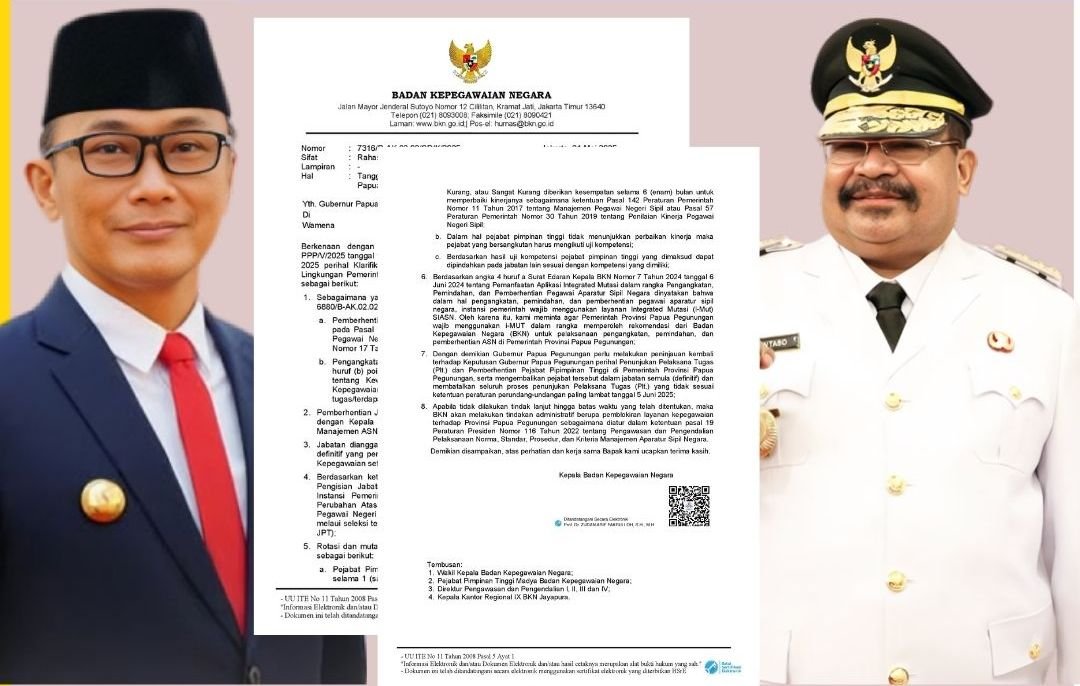 Kepala BKN Prof Dr Zudan Arif Fakrulloh, SH, MH dalam surat resminya nomor 7316/R-AK.02.02/SD/K/2025, perihal tanggapan atas Surat Klarifikasi Papua Pegunungan, meminta Gubernur Jhon Tabo untuk segera melakukan peninjauan ulang atas keputusan memutasi sejumlah pejabat teras di Pemprov Papua Pegunungan.