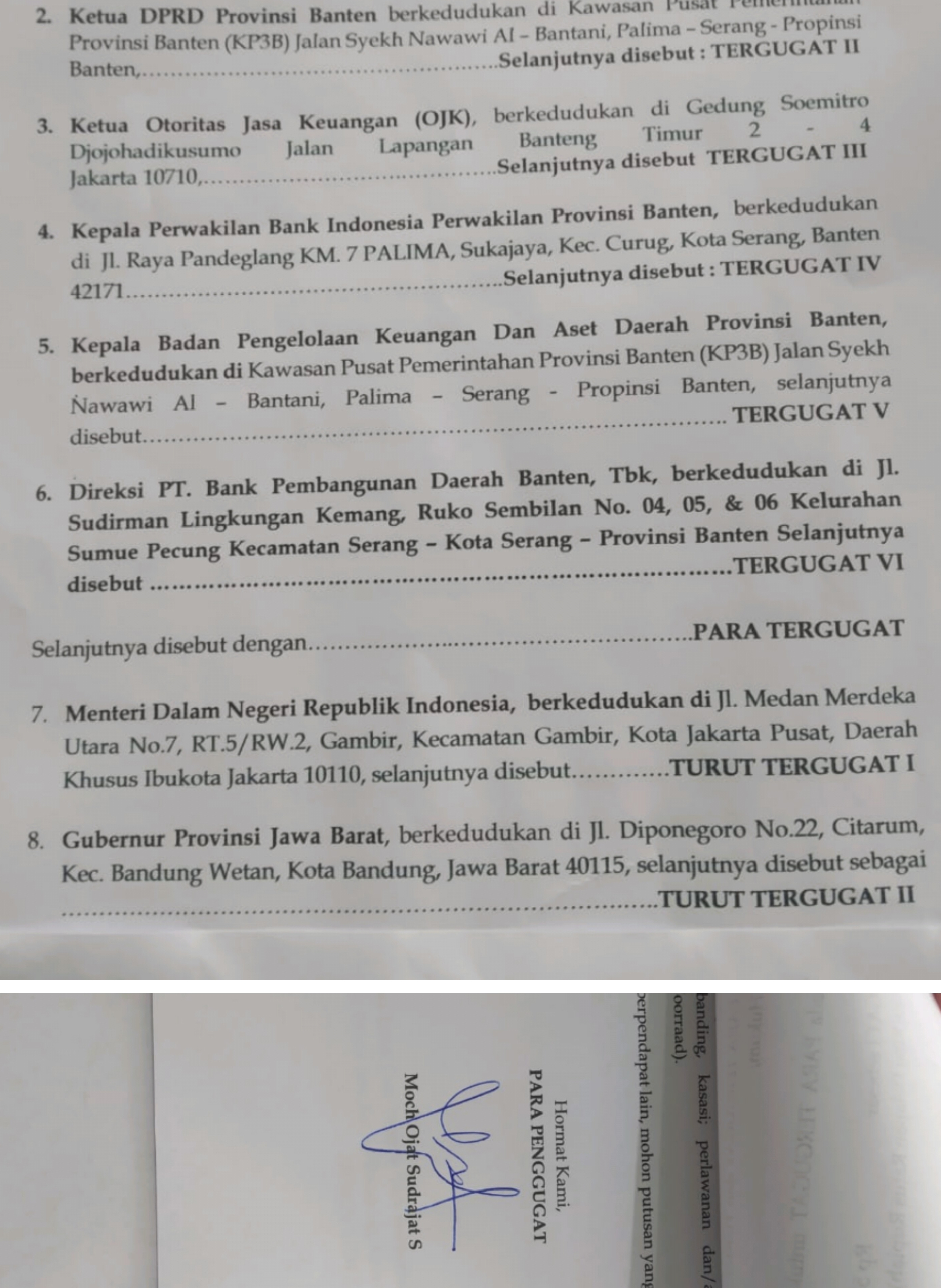 MAJALAHTERAS.COM – Setelah sekian lama berpolemik ditengah masyarakat, kini permasalahan Bank Banten memasuki babak baru, yakni telah resmi didaftarkan sebagai gugatan perdata melalui E COURT yg terdaftar di PN SERANG oleh, Moch Ojat Sudrajat s, Warga Kabupaten Lebak, Ikhsan Ahmad warga Kota Serang sekaligus sebagai Akademisi Untirta, dan Agus Supriyanto, warga Kota Tangerang Selatan.